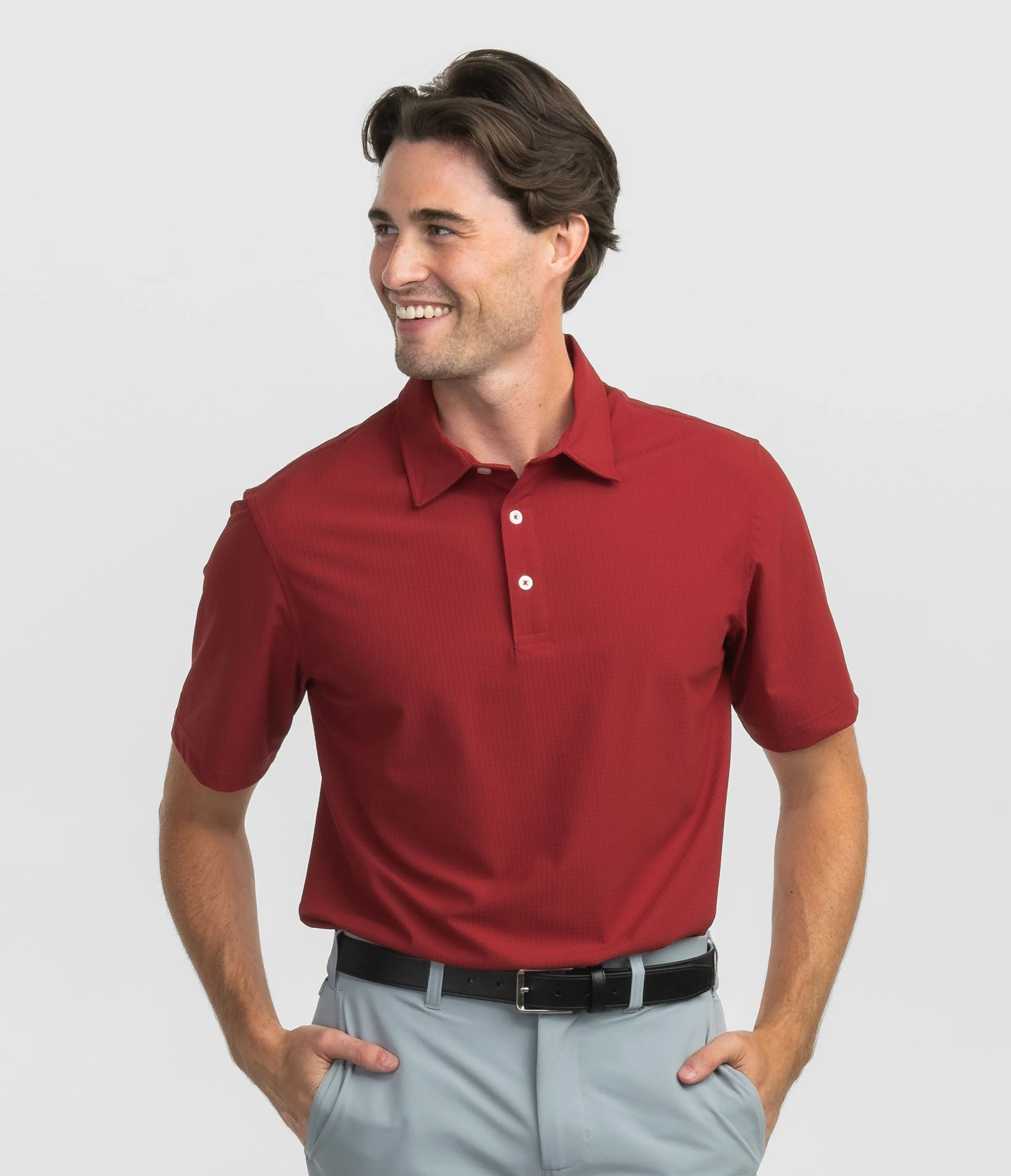 Brandon is 6’0” and is wearing a medium Next Level Performance Polo in University Red.