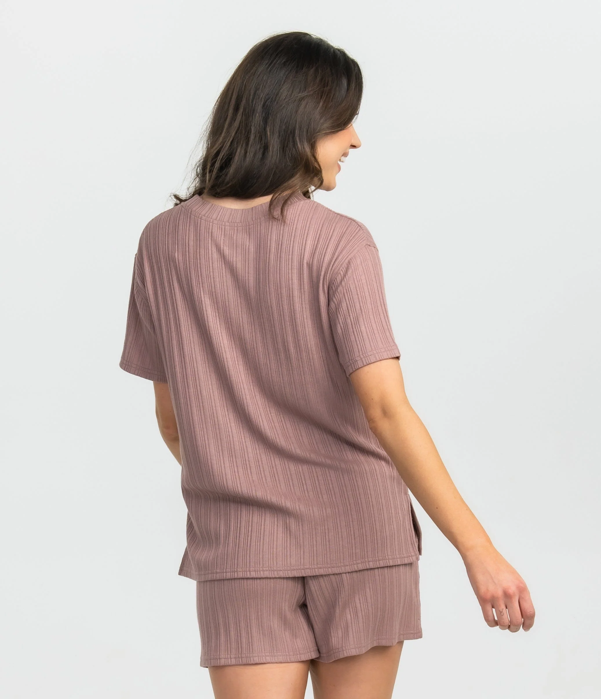 Specialty ribbed knit pieces are designed to be worn separately or together. The Sunny Days Top is slightly oversized for comfort and the matching shorts feature an elastic waistband and drawstring tie.