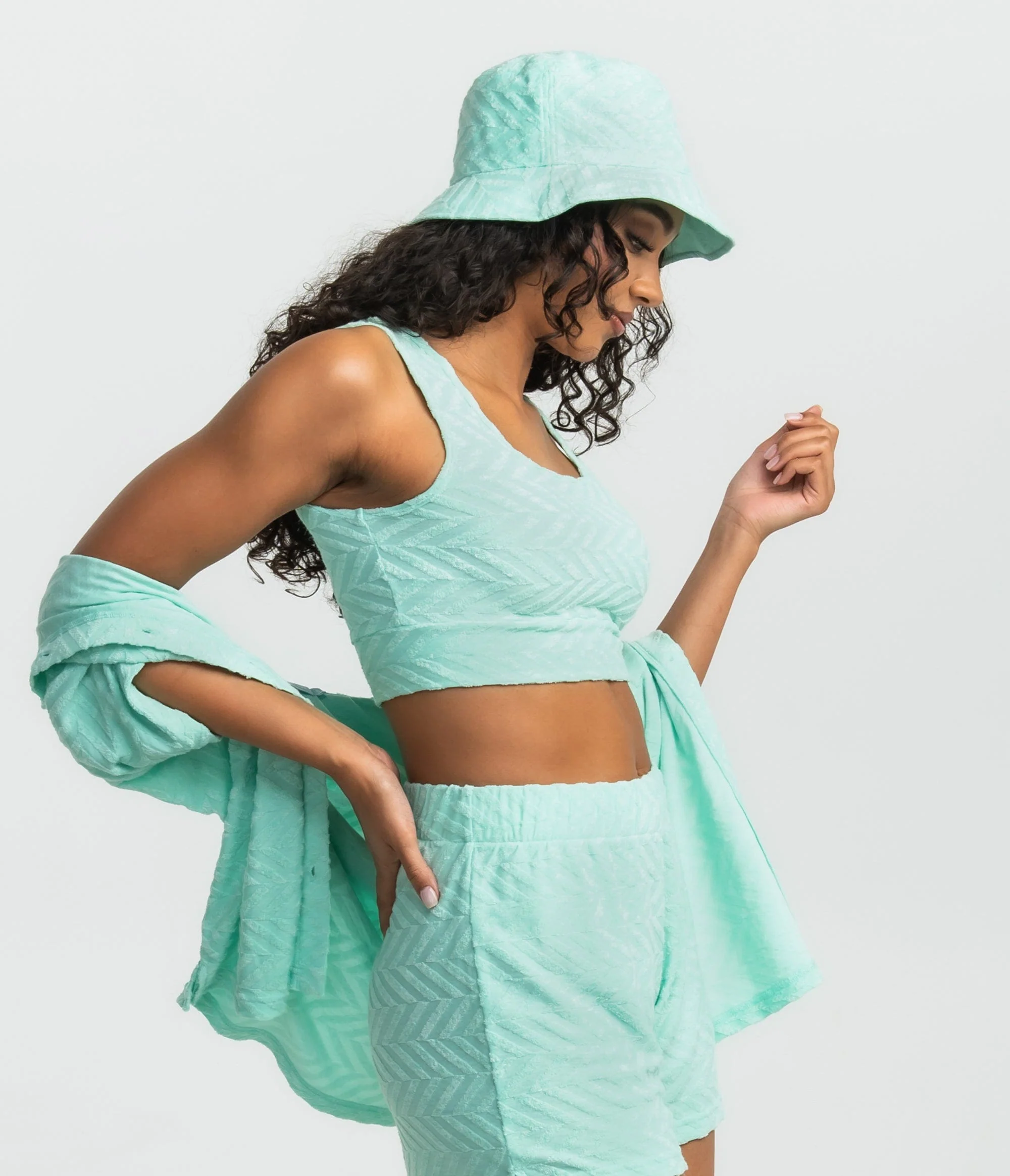 The button-up shirt offers a versatile top to pair with a favorite outfit or bikini and the long-line brami is cut right at the waist for a flattering fit. For more matchy-matchy vibes check out the Towel Off Terry Shorts and Bucket Hat to complete your look.
